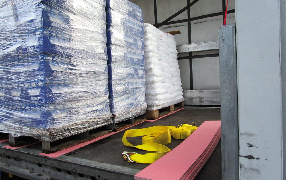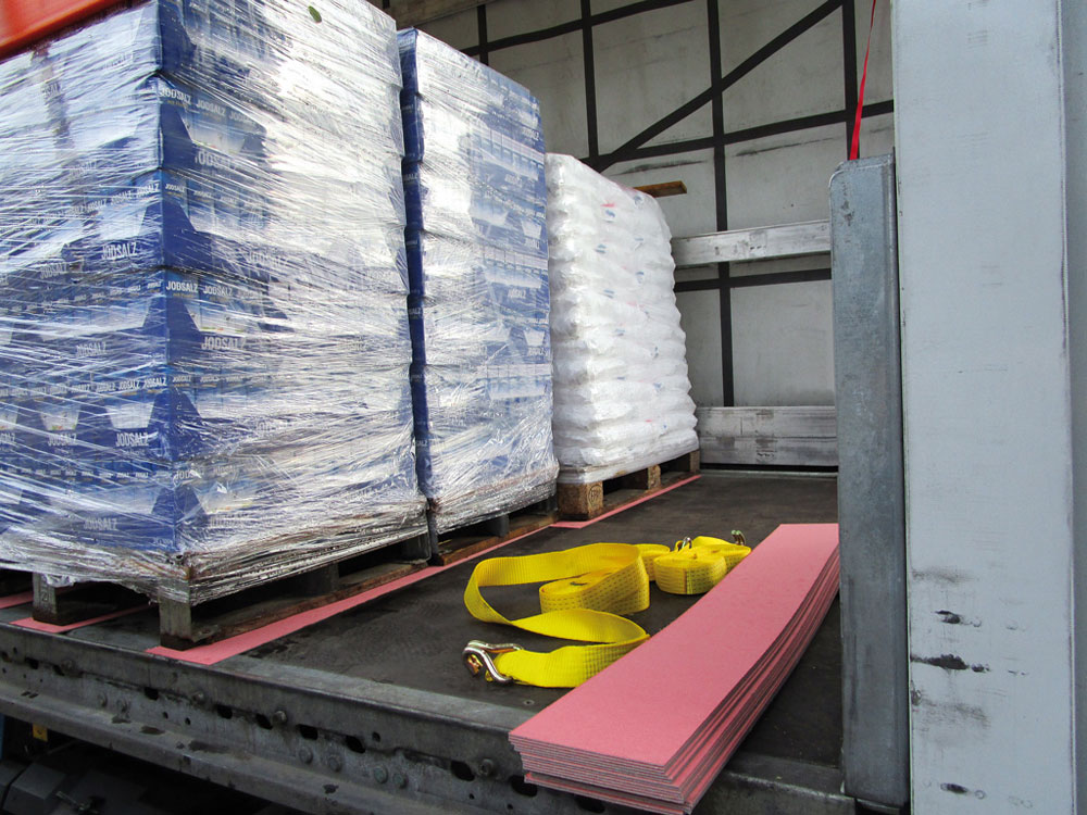 They are used for load securing, ensuring the cargo does not slip during transport. It is important to make sure the contact areas are swept clean and free from oil, grease or ice, as otherwise we cannot guarantee reliable protection from slippage. Safety Grip is easy to use either as an anti-slip mat under the pallet, i.e. between lorry bed and pallet, flat on the pallet or as intermediate layer between cargo units such as cardboard packaging.